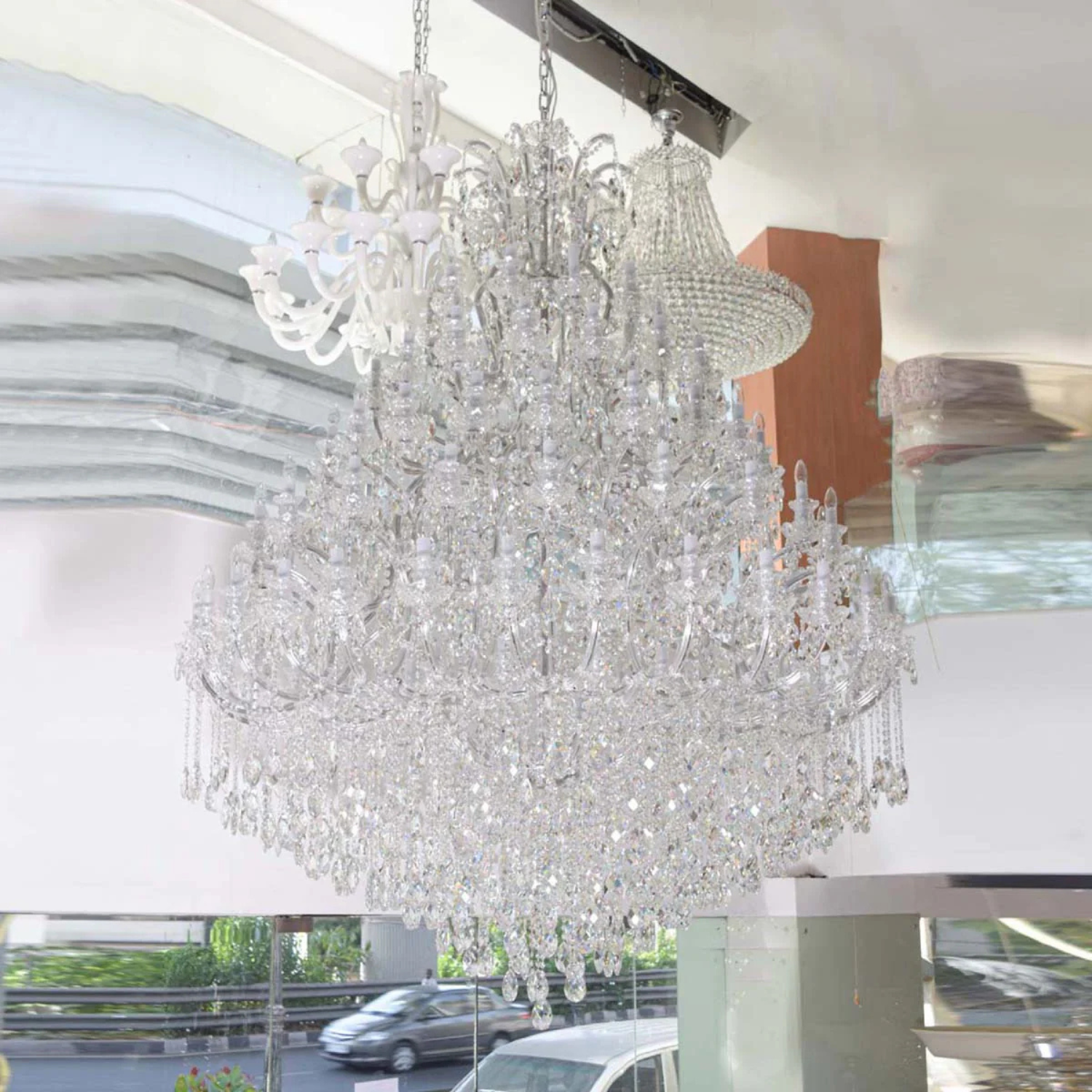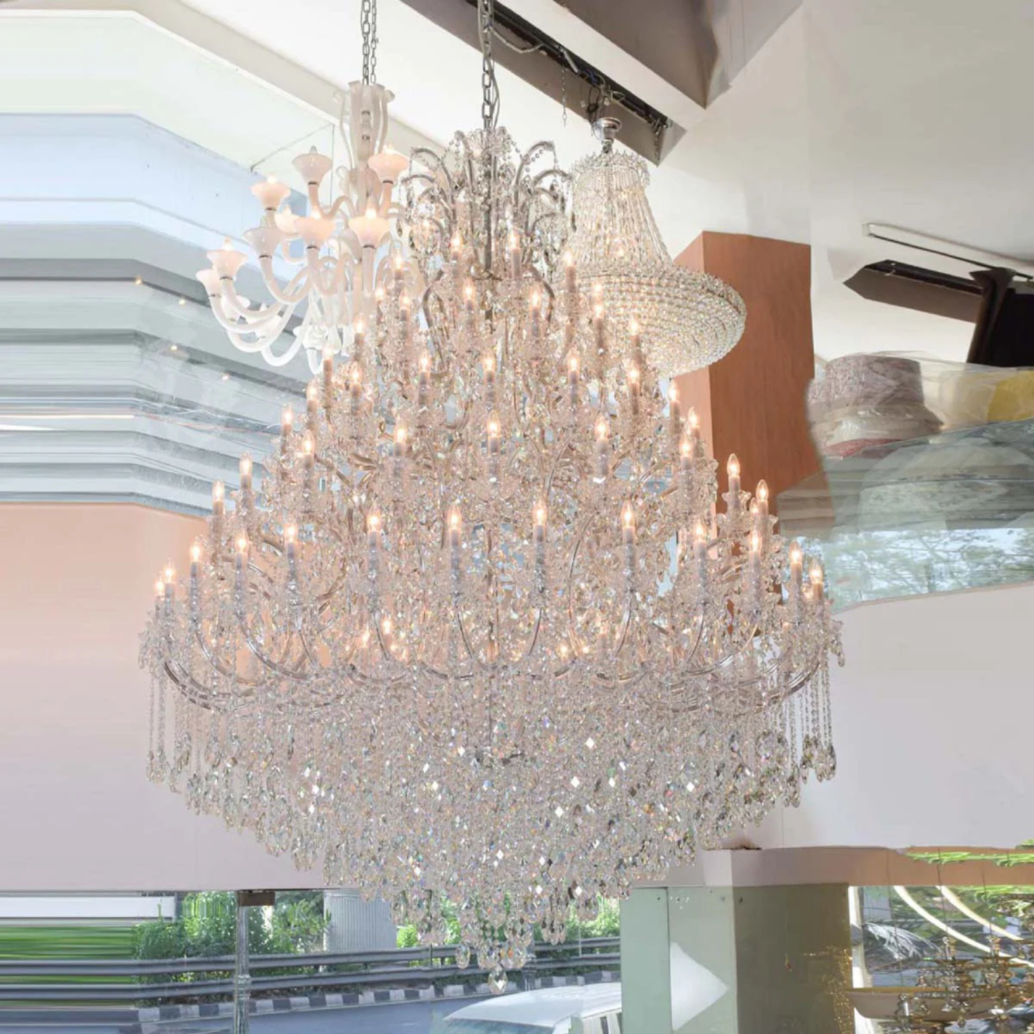 A true masterpiece that radiates opulence and elegance. This mesmerizing chandelier effortlessly combines chrome finish with sparkling clear crystals, creating an enchanting display of light and luxury. With its grand design and impressive 105 lights, this chandelier will instantly transform any space into a glamorous haven.