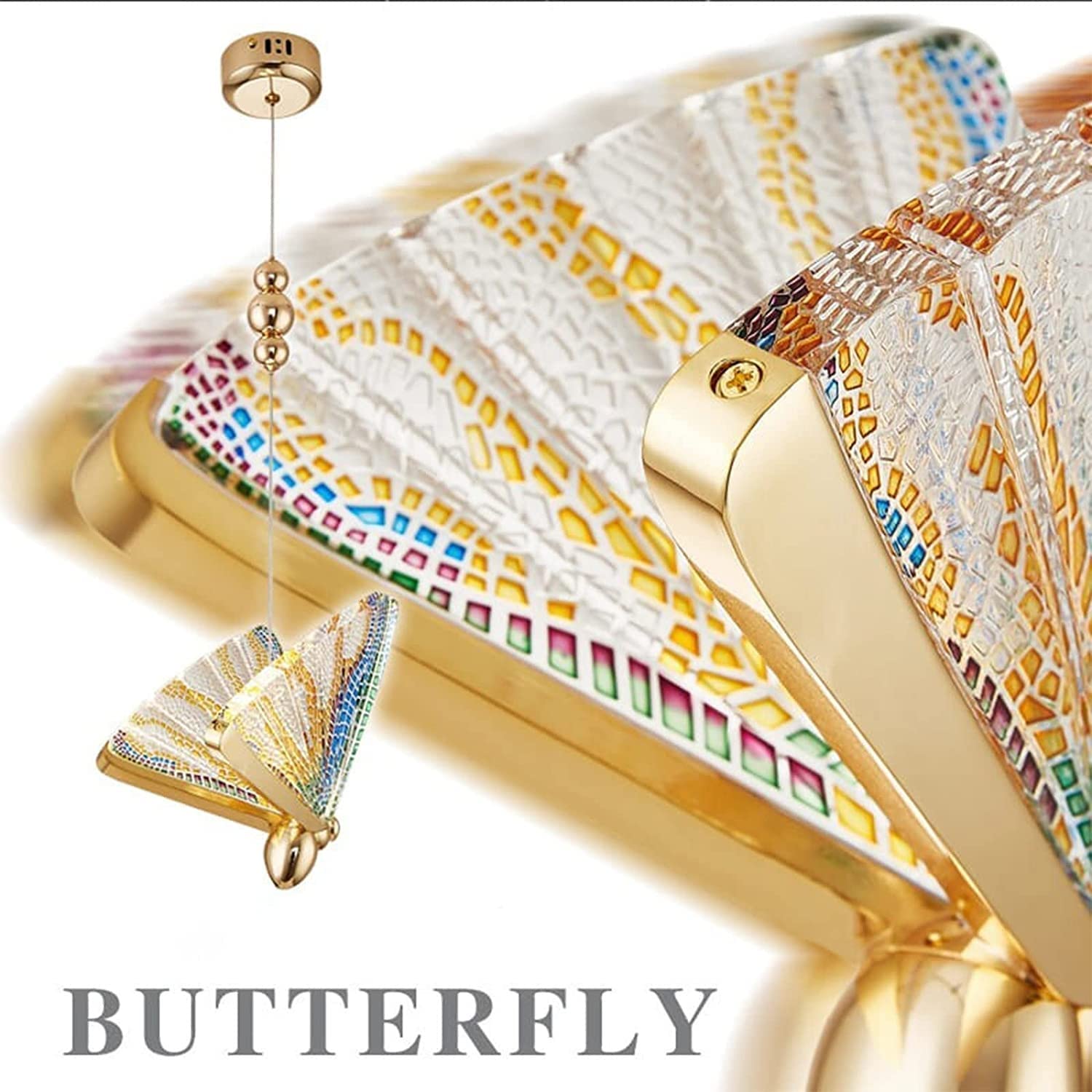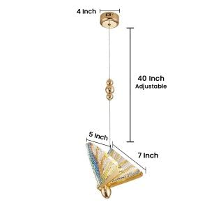 A beautifully designed butterfly pendant light that adds an elegant and whimsical touch to a modern bedroom. The light fixture is shaped like a butterfly with a gold-colored base and intricate, multicolored wings that shimmer when illuminated. The butterfly’s wings are composed of a reflective material, enhancing the effect of light in a soft, multicolored glow.